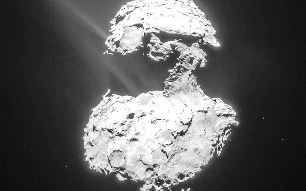 Από πού προέρχονται οι ουρές των κομητών; Δεν υπάρχει κανένα προφανές σημείο πάνω στον πυρήνα ενός κομήτη από το οποίο πηγάζουν οι πίδακες που δημιουργούν τις ουρές των κομητών. Μια από τις καλύτερες φωτογραφίες των αναδυόμενων πιδάκων είναι αυτή της εικόνας, που έχει ληφθεί το 2015 από το ρομποτικό διαστημικό σκάφος της Ευρωπαϊκής Υπηρεσίας Διαστήματος Rosetta, το οποίο κινούνταν σε τροχιά γύρω από τον κομήτη 67P/Churyumov-Gerasimenko (ή αλλιώς CG) από το 2014 μέχρι το 2016. Η φωτογραφία δείχνει στήλες αερίου και σκόνης να διαφεύγουν από διάφορα σημεία του πυρήνα του κομήτη CG καθώς αυτός προσέγγιζε τον Ήλιο και θερμαινόταν. Ο κομήτης έχει δύο χαρακτηριστικούς λοβούς, από τους οποίους ο μεγαλύτερος έχει πλάτος περίπου 4 χιλιόμετρα και ο μικρότερος περίπου 2,5 χιλιόμετρα, και συνδέονται μεταξύ τους από έναν στενό λαιμό. Οι αναλύσεις υποδεικνύουν ότι για να δημιουργούνται οι πίδακες σκόνης και πάγου που βλέπουμε να εκτινάσσονται διαμέσου της επιφάνειας, η εξάτμιση θα πρέπει να συμβαίνει μέσα από την επιφάνεια του κομήτη. Ο κομήτης CG χάνει λόγω των πιδάκων περίπου ένα μέτρο της ακτίνας του σε καθεμία από τις διάρκειας 6,44 ετών τροχιές του γύρω από τον Ήλιο. Με έναν τέτοιο ρυθμό απώλειας, προβλέπεται να καταστραφεί εντελώς μέσα με λίγες χιλιάδες χρόνια. Το 2016, η αποστολή της Rosetta έληξε με μια ελεγχόμενη πρόσκρουση στην επιφάνεια του κομήτη CG.